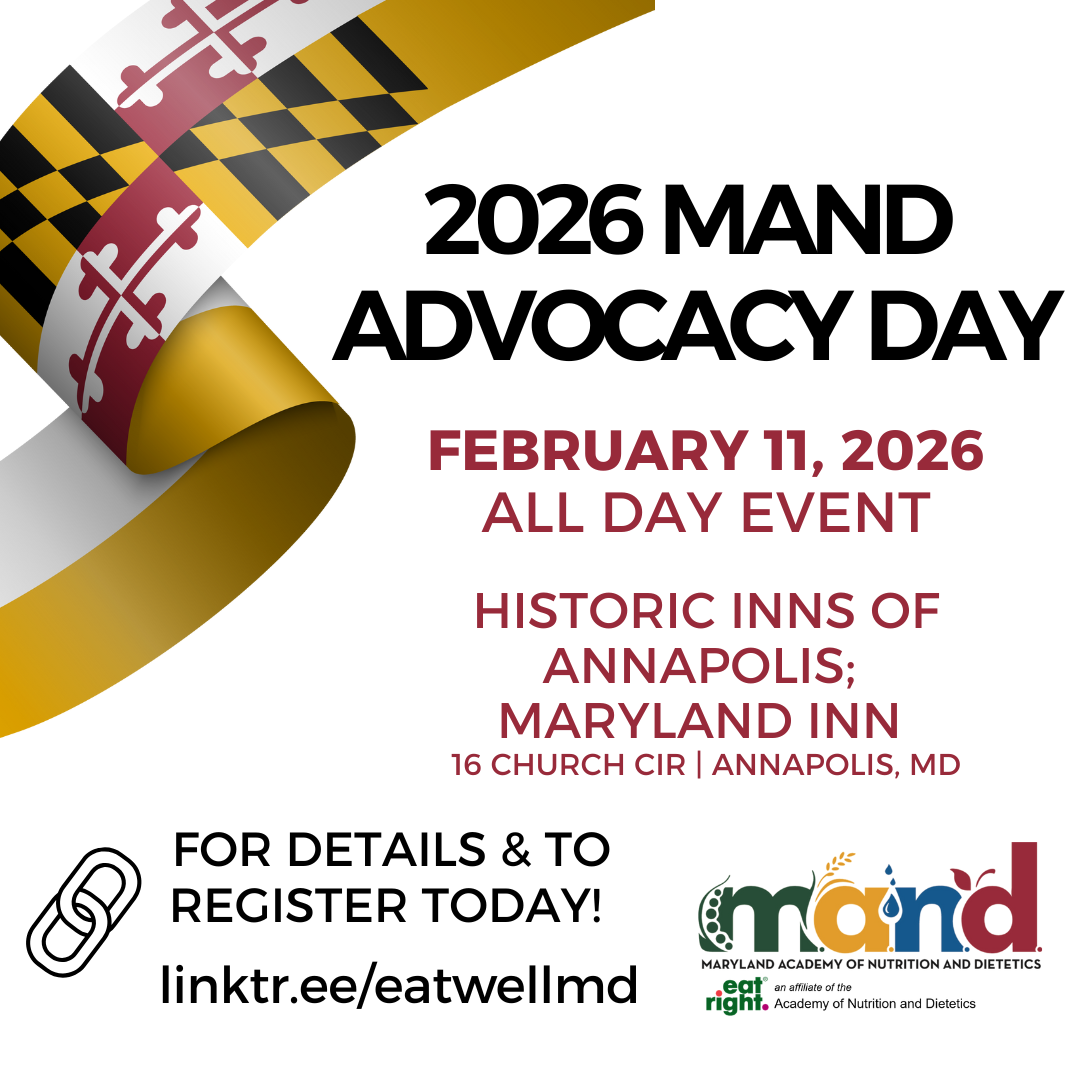 As nutrition professionals, advocacy is our responsibility and we must take action in order to achieve the profession's goals, maintain licensure and our scope, modernize practice, protect the consumer and promote MAND's vision of optimizing the health and wellbeing of Marylanders through food, nutrition, and policy. We have the ability to influence policy maker’s decisions to support bills and future policies that will promote health and reduce the burden of chronic disease on a large scale. We continue to take an active role in building relationships with legislators to gain their support.