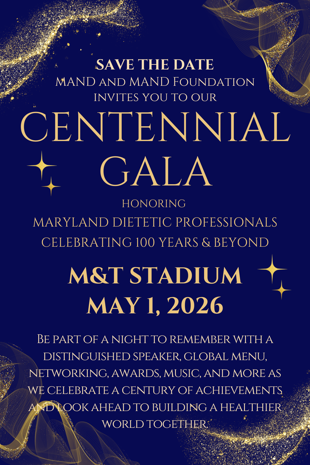 Join us at M&T Bank Stadium for a once-in-a-century gala as the Maryland Academy of Nutrition and Dietetics commemorates its 100th anniversary. Co-hosted by MAND and the MAND Foundation, this festive and educational fundraiser will celebrate our profession’s legacy and support future advancement.